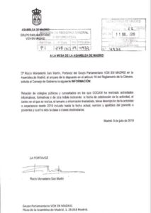 El escrito de Vox solicitaba al Consejo de Gobierno de la Comunidad de Madrid información de colegios públicos y concertados en los que el colectivo LGTBI Cogam ha realizado actividades informativas, formativas o de otra índole. En concreto, requería la «fecha de celebración de la actividad, el centro en el que se realiza, el temario o información trasladada, breve descripción de la actividad o experiencia desde 2015 incluido hasta la fecha actual, nombre y apellidos del ponente o ponentes y cuál ha sido la clase o clases destinatarias».