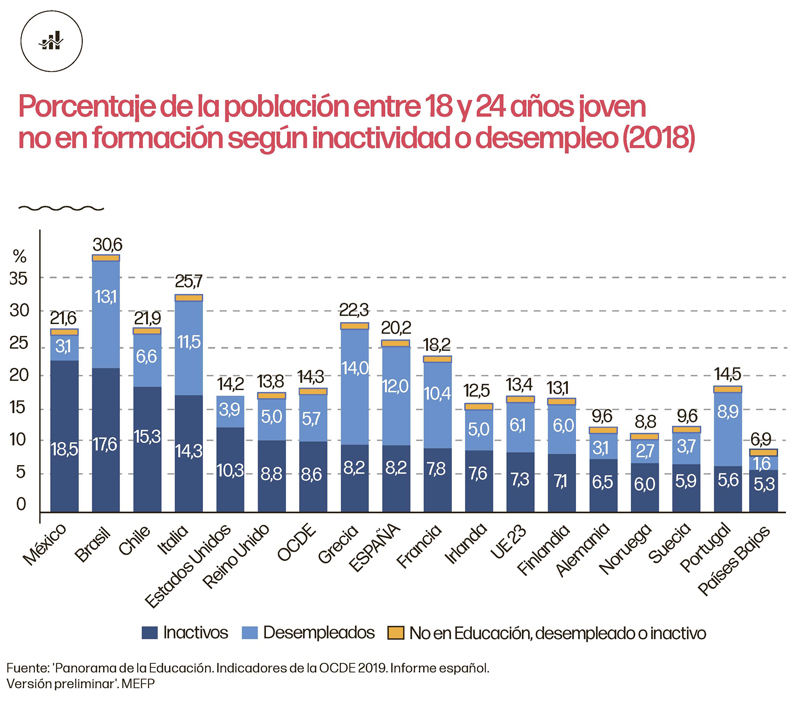 Una lacra que afecta especialmente a los jóvenes. Si en la media de la OCDE un 1,5% de los que no están estudiando han estado desempleados más de un año, en España el porcentaje supera el 3%.