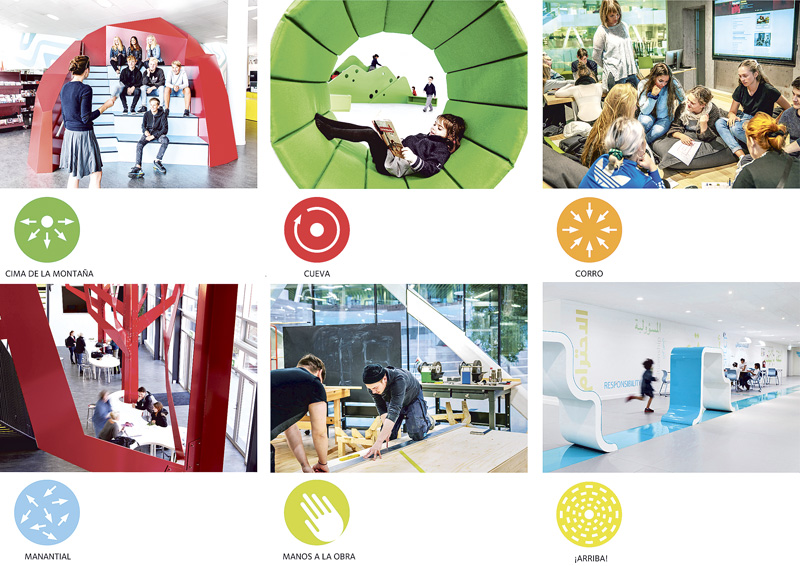 A modo de ejemplo, en nuestro trabajo con el Ministerio de Educación de Argentina, a quien asesoramos en el desarrollo de unos criterios para reorganizar el espacio en las escuelas de Secundaria del país, el paisaje se organizó en base a categorías como «barrios», que son lugares en los que acudir a presentaciones y hacer trabajos en grupo o de manera individual, y equivaldría a un conjunto de tres aulas tradicionales. También estaba la «plaza», que es un espacio común, al que los estudiantes pueden acceder para trabajar por su cuenta o intercambiar opiniones con otros, o el «exterior», que se activa también como un entorno de aprendizaje.