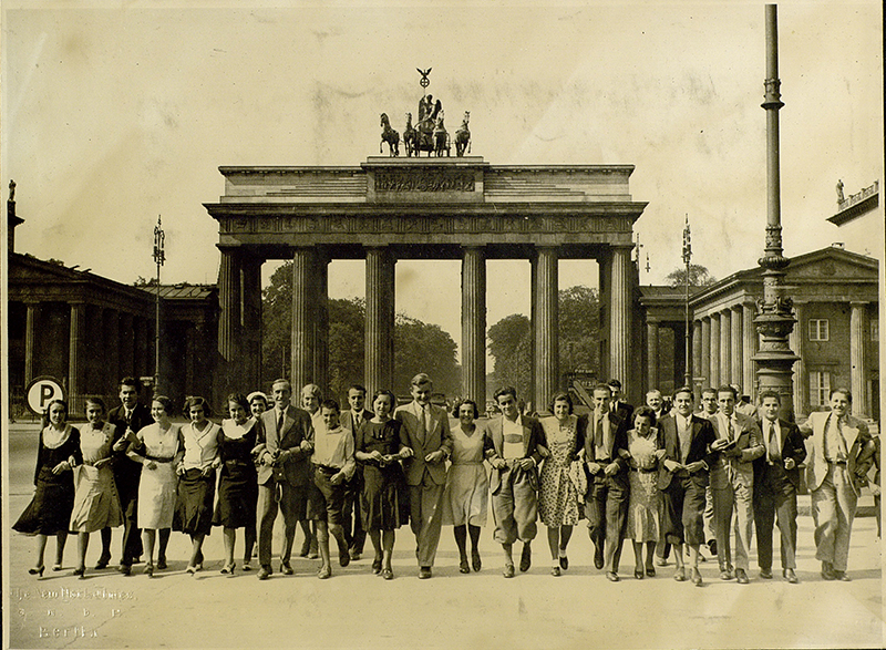 Alumnos del «I-E» con el profesor Oswald Jahns ante la Puerta de Brandeburgo, en una excursión en 1931.