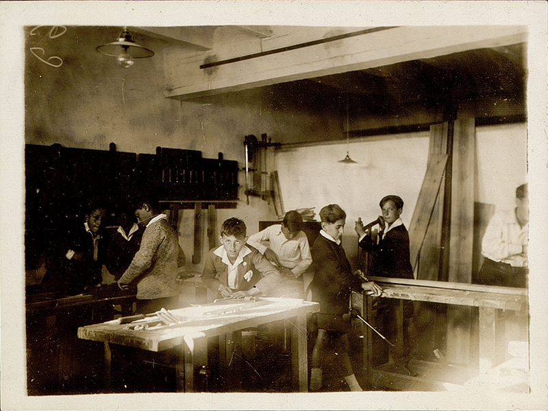 Alumnos del «I-E» trabajando en el taller de carpintería en la sede de Miguel Ángel 8, hacia 1925.