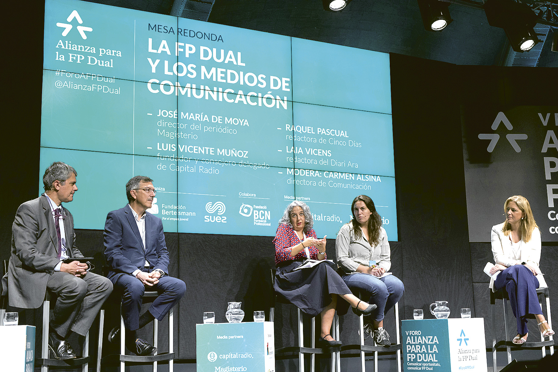 De izq. a der., José Mª de Moya, de MAGISTERIO; Luis Vicente Muñoz, de Capital Radio; Raquel Pascual, de Cinco Días; Laia Vicens, del Diari Ara; y Carmen Alsina, que ejerció de moderadora.