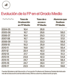La Formación Profesional en España está despegando. Desde el curso 2008-09 el número de alumnos matriculados en FP Básica, FP Media o Superior ha ascendido en un 77,0% hasta alcanzar los 861.906 en el curso entrante 2019-20 (Ministerio de Educación y Formación Profesional: Datos y Cifras. Curso escolar 2019-20). La formación de los titulados en FP es valorada en el mercado de trabajo. La tasa de paro de los titulados de FP Media, por ejemplo, es del 13,6% en 2018 mientras que la de los titulados en Bachillerato es del 13,9% (OCDE, Education at Glance, 2019). Uno de los grandes cambios de la Educación en España ha sido el aumento en la tasa de graduación en estudios medios desde el 56% de 2005 al 81% de 2017.