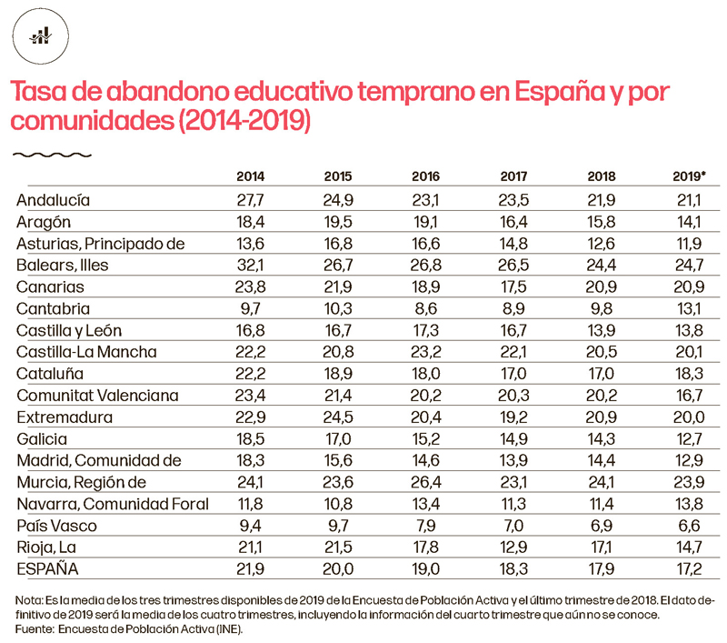 En concreto, la Comisión estableció como meta reducirlo al 10,0% en el conjunto de la Unión y al 15,0% en España. País Vasco (6,6%), Asturias (11,9%), Galicia (12,7%) y Madrid (12,9%), son las Comunidades con menos jóvenes entre los 18 y 24 años que hayan abandonado sus estudios.