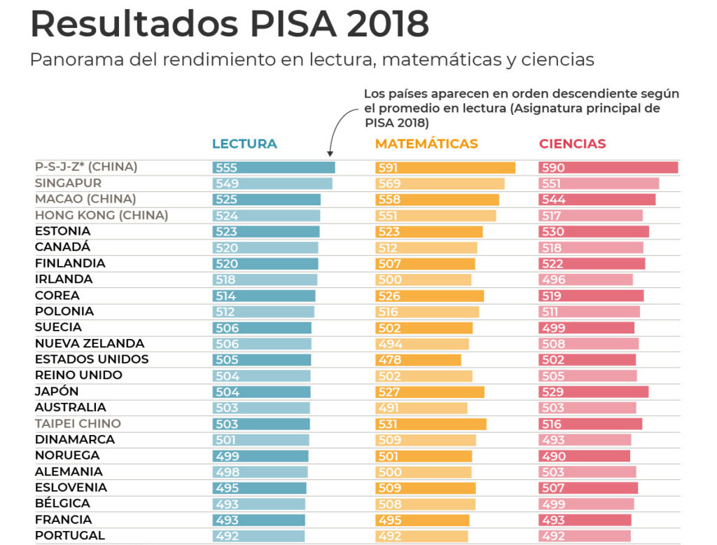 En esta última edición vuelven a arrasar los países asiáticos (China, Singapur, Hong Kong, Corea, Japón…) y también salen muy bien parados Estonia, Canadá y Finlandia (aunque esta última mejor en Lectura y Ciencias que en Matemáticas). China logra 591 puntos en Matemáticas. Si se tiene en cuenta que para la OCDE 30 puntos PISA equivalen a un curso de escolaridad, la distancia se eleva a unos tres cursos.
