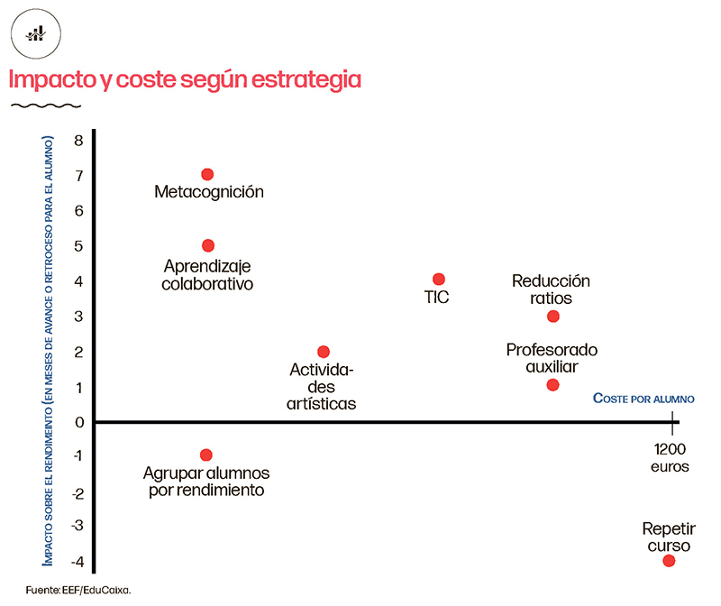 Al otro lado del espectro, encontramos enfoques didácticos altamente recomendables. Por ejemplo, apostar por la metacognición, rimbombante término que suele agrupar aquellas iniciativas que fomentan la difusa competencia de aprender a aprender (o, en sentido aun más amplio, aprender a pensar). Cultivar esta habilidad en clase dispara los resultados, sobre todo en Lengua y Matemáticas y entre alumnos de Secundaria. Implica, además, un coste económico muy modesto.