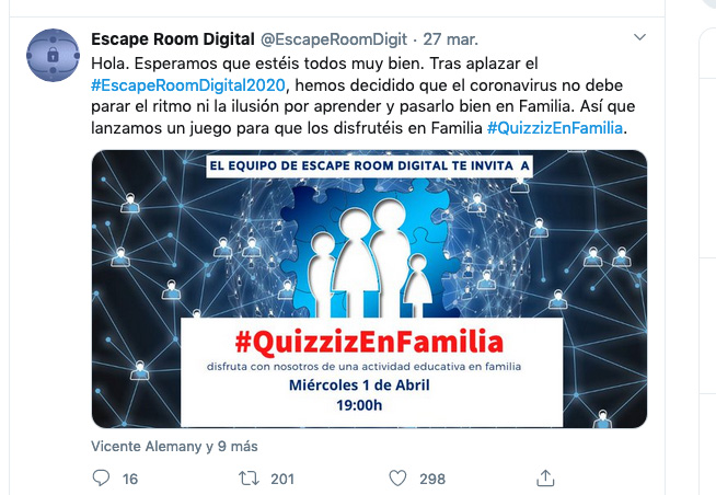 Este grupo de creativos docentes ha generado una página web en la que está toda la información. El día elegido para el juego es el próximo 1 de abril a las 19 horas (horario peninsular). La difusión por las redes sociales ha tenido muy buena aceptación, y el hashtag usado ha sido #QuizzizEnFamilia , por lo que solamente queda esperar a que llegue el día de la prueba y los que decidan participar pasen un rato agradable, divertido, haciéndonos olvidar (aunque sea por un ratito) la actual situación en todos los hogares de medio mundo.
