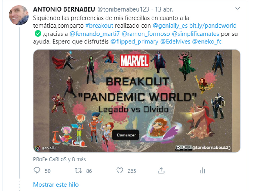 Pandemic World o ‘Pandemia Mundial’ es un breakout preparado por el docente Antonio Bernabeu. Este profesor de Primaria y Educación Física es uno de los maestros más seguidos en las redes sociales y tiene en su haber varios premios de innovación educativa. Planteó este breakout escuchando a los intereses de sus alumnos: “En los días previos a las vacaciones de Semana Santa pasé a los ‘fierecillas’ de mi tutoría de 5º y 6º de Primaria un cuestionario para sondear sus preferencias en cuanto a la temática que ellos elegirían para crear un breakout (les encanta este tipo de actividades), con la información obtenida, yo me comprometía a crear uno en los primeros días de dicho periodo vacacional y, de esa forma, que ellos pudieran hacerlo en estos días de descanso. Ese fue el origen de este breakout llamado Pandemic World y que tiene como tema central algo muy actual, como es la situación de pandemia mundial a causa del Covid-19”