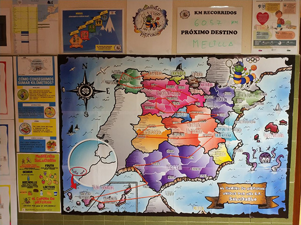 Para conseguir este ambicioso proyecto han tenido en cuenta el aspecto lúdico. “Estamos utilizando una metodología innovadora como es la gamificación. Basándonos en la estructura del Camino de Santiago, decidimos darle forma para que el alumnado conociera de una manera divertida la geografía española a través de sumar kilómetros “virtuales” de manera saludable a través de cuatro ejes como son la actividad física, la alimentación saludable, el desarrollo sostenible por medio de reciclaje y la lectura. Cada grupo de caminantes dispone de un pasaporte con todos los centros educativos que tienen que visitar en su camino, de tal manera que al llegar simbólicamente a cada uno de ellos, se les otorgará una “provinciala” a modo de sello, como comprobante de su paso, además recibirán un vídeo del alumnado de ese centro explicando cosas relacionadas con la provincia, para conocer mejor sus costumbres, festividades, gastronomía, monumentos más importantes,… para concluir el proyecto en el mes de junio con el objetivo de haber completado todo el camino, celebraremos el día del medio ambiente con unas olimpiadas con material reciclado”, explica Chamorro.