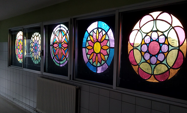 La parte central de “El tiempo de las catedrales” es la creación de unas vidrieras de papel para colocarlas en los ventanales de la fachada principal del centro. En un principio se realizaba sólo en el piso de Formación Profesional, pero de cara al 2021 se realizará en los cursos sucesivos hasta completar la fachada al completa, una manera de visualizar el trabajo del alumnado de Formación Profesional Básica en el centro y en la ciudad.
