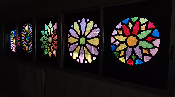 En los módulos prácticos se crean las vidrieras con modelos entregados por el profesorado, con un proyector y papel kraft. Posteriormente se recortan y se pegan los trozos de papel celofán de colores. Una vez realizadas se instalarán en los ventanales y comenzarán a preparar una instalación de luz led para la iluminación nocturna, que estará conectada a un reloj que hará que las vidrieras se iluminen al atardecer y se apaguen al amanecer.