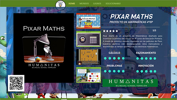 Pixar Maths es una plataforma diseñada por los cinco docentes que imparten clase en 4º curso de Educación Primaria (Elena Vela, Esperanza Poyato, José Carlos Herrera, Sonia Sanz y Carlos Negrín) ambientada en películas de los estudios Disney Pixar. Está estructurada en doce mundos que corresponden a cada una de las doce primeras películas de esta factoría. Cada uno de ellos, a su vez, está dividido en varios niveles en los que se trabajan las cuatro destrezas matemáticas más importantes en estas edades: cálculo mental, operaciones, lógica y resolución de problemas.