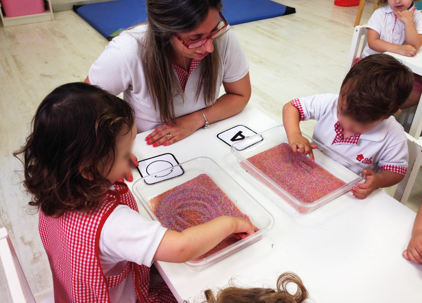 Por esta razón, hemos ido incluyendo, de manera flexible y en grupos reducidos, actividades que plantean una iniciación sensorial al conocimiento de las letras. Para desarrollar esta metodología, hemos utilizado los siguientes materiales: letras de lija, alfabeto móvil de madera, mesa de luz, letras traslúcidas, letras de texturas, tijera y pauta horizontal Montessori.