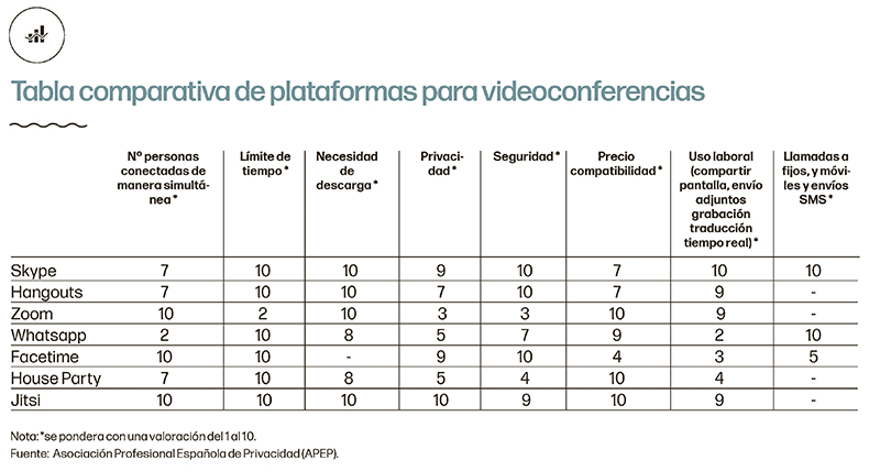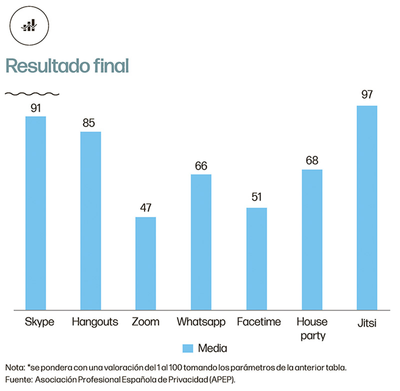 Las que mejor nivel de privacidad presentan son Skype, Facetime y Jitsi; y la peor parada aquí vuelve a ser Zoom. Las más seguras son Skype, Hangouts, Facetime y Jitsi; y de nuevo Zoom aparece en el último lugar con muy baja puntuación.