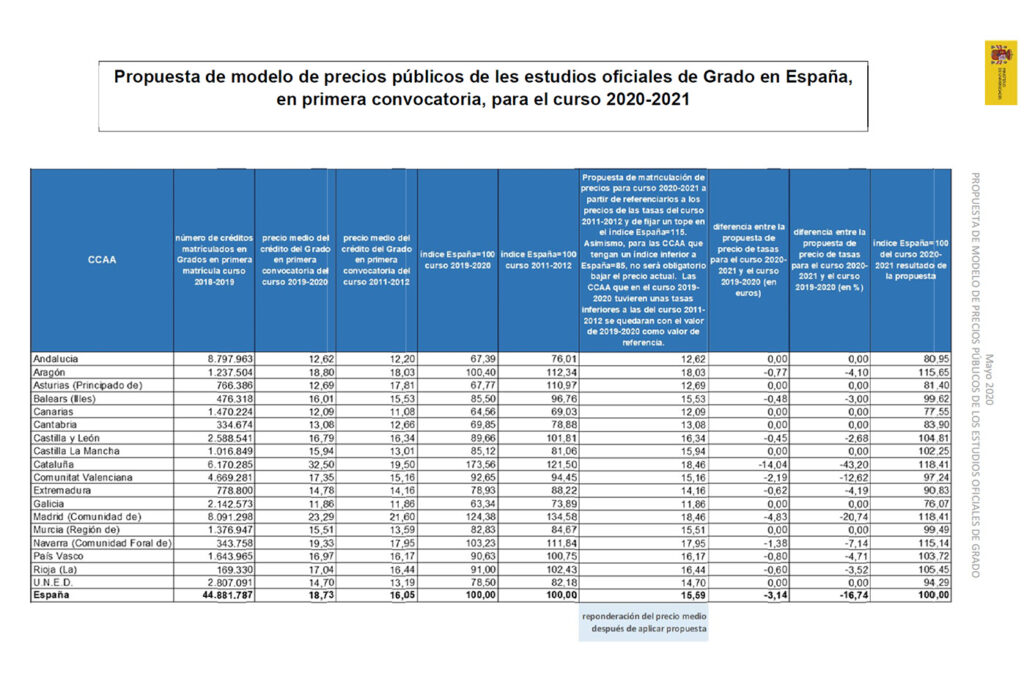 La Propuesta de modelo de precios públicos de matrícula de los estudios oficiales de Grado para el curso 2020-2021, presentada por Castells a las comunidades y aprobada en Conferencia General de Política Universitaria, señala que no tendrían que bajar sus precios con respecto a 2019-20 Andalucía, Asturias, Canarias, Cantabria, Castilla-La Mancha, Galicia y Murcia. En cambio, otras ocho comunidades (Aragón, Baleares, Castilla y León, Comunidad Valenciana, Extremadura, Navarra, País Vasco y La Rioja) tendrían que operar «un ajuste relativamente moderado», mientras que para Cataluña y Madrid el ajuste tendría que ser «más acusado».