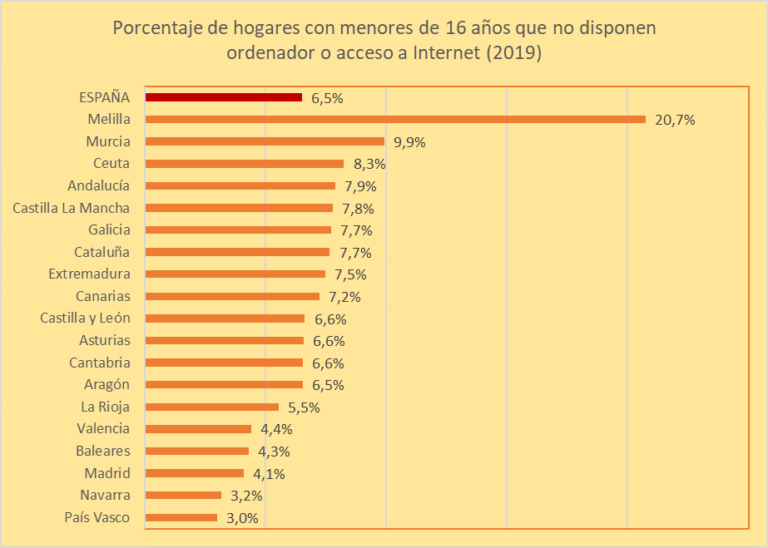 El 20,7% de niños y adolescentes en Melilla que no tienen ordenador o Internet en sus casas; frente al 3% de hogares con la misma carencia en el País Vasco