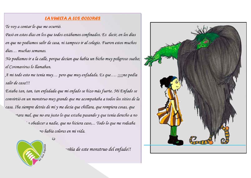 Estaba tan, tan, tan enfadada que mi enfado se hizo más fuerte. Mi Enfado se convirtió en un monstruo muy grande que me acompañaba a todos los sitios de la casa. Iba siempre detrás de mí y me decía que chillara, que rompiera cosas, que me portara mal, que no era justo lo que estaba pasando y que tenía derecho a no hacer caso ni a obedecer a nadie, que no hiciera caso,… Todo lo que me rodeaba era de color gris. Ya no había colores en mi vida.