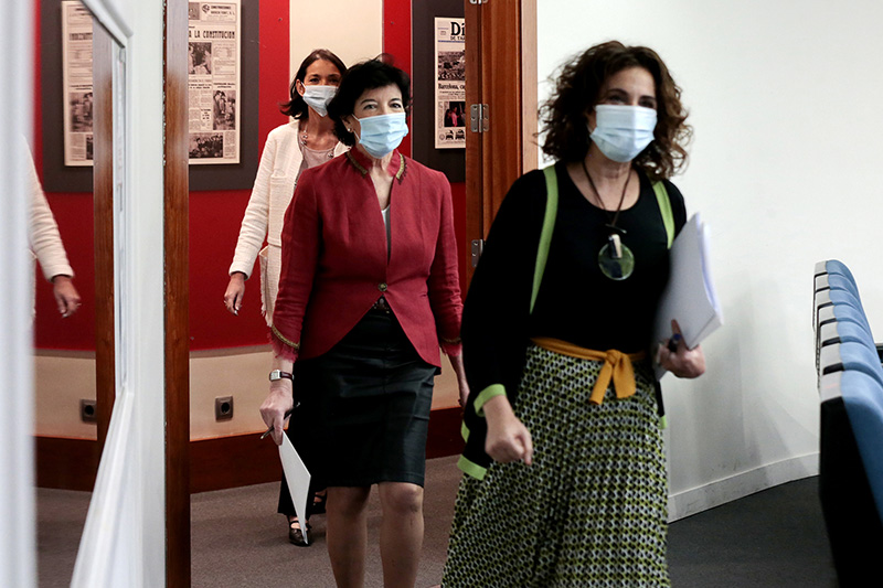 La ministra de Hacienda y portavoz del Gobierno, María Jesús Montero, la ministra de Educación, Isabel Celaá, y la ministra de Industria, Comercio y Turismo, María Reyes Maroto, llegan a la rueda de prensa posterior al Consejo de Ministros. POOL MONCLOA/JM CUADRADO