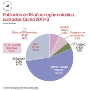 Por lo que respecta al abandono escolar, el CEE cree que es consecuencia de lo anterior: la limitación que el Título de la ESO impone a todo el alumnado que no lo obtiene y ya no puede repetir. Véase, sino, la escolarización a los 16 años en el gráfico junto a estas líneas. El 54% accede al Bachillerato, pero solo un 4,6% accede a esa edad a la FP y un tercio no pudo pasar de la ESO. «Es imprescindible un auténtico esfuerzo inversor para dar oportunidad a ese tercio de alumnos de acceder a una de las vías señaladas, lo cual exige mejorar la oferta de FP», concluye el informe del CEE.
