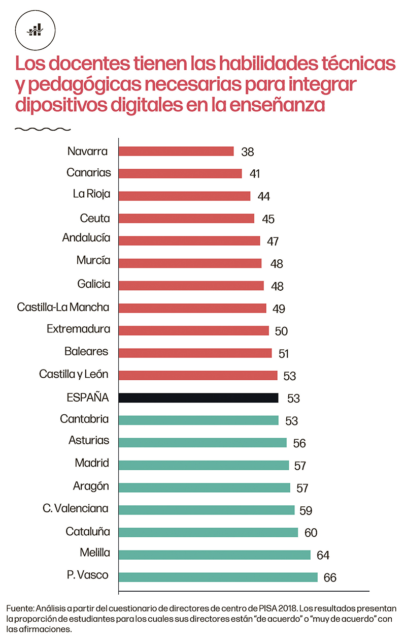 Igualmente, los recursos profesionales y las habilidades técnicas de los docentes para adaptarse a la enseñanza digital difieren mucho entre comunidades, de hasta 30 puntos porcentuales, igual que en el apartado anterior.