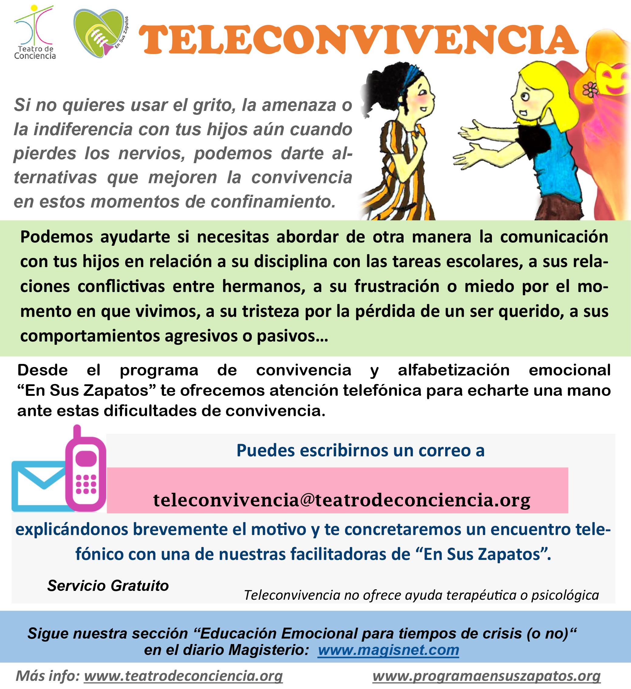 Ofrecemos también un Servicio de atención telefónica gratuito: TELECONVIVENCIA (teleconvivencia@teatrodeconciencia.org) para ayudarte a abordar de otra manera la comunicación con tus hijos en relación a su disciplina con las tareas escolares, a sus relaciones conflictivas entre hermanos, a su frustración o miedo por el momento en que vivimos… Envíanos un breve mail explicándonos el motivo y te concretaremos un encuentro telefónico con una de nuestras facilitadoras de “En Sus Zapatos”.