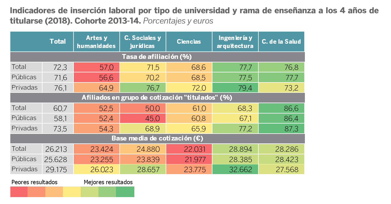 Esta edición del estudio incluye un análisis detallado de la inserción laboral por ramas de enseñanza y universidades. En este aspecto, la diversidad es notable y, aunque la variable más relevante para la empleabilidad es el tipo de estudios cursados, la titularidad de los centros importa también en la inserción. Los egresados de las universidades privadas presentan mejores indicadores medios de afiliación a la Seguridad Social, bases de cotización y porcentaje de contratados en puestos que requieren titulación universitaria.