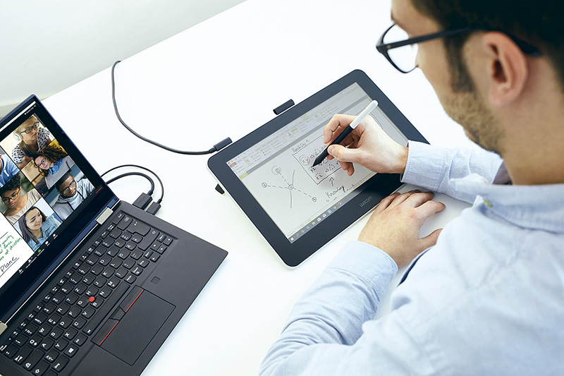 - Colaborar con otros. Aplicaciones de videoconferencia como Zoom suponen una oportunidad para emprender proyectos conjuntos. Wacom One, al ser compatible con ellas, permite hacer revisiones y añadir sugerencias simultáneas y en tiempo real.