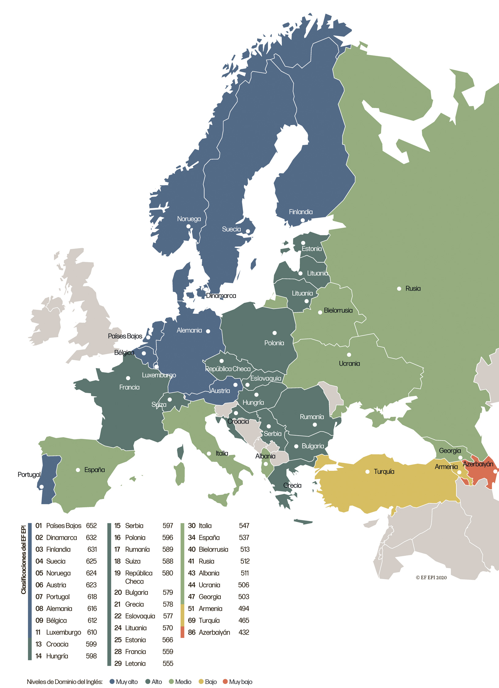 Como siempre, los países europeos con mayor nivel de inglés se concentran en el norte (Países Bajos, Dinamarca, Finlandia, Suecia y Noruega). Los sistemas educativos de estos países siguen varias estrategias clave, que incluyen un enfoque temprano en las habilidades comunicativas, la exposición diaria al inglés tanto dentro como fuera de las aulas y la instrucción lingüística específica por rama profesional en los últimos años de los estudios, sean de Formación Profesional o universitarios.