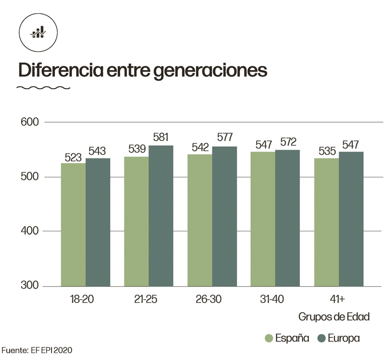 De esta forma, mientras que el resto de países de nuestro entorno mejora notablemente su nivel de inglés después de los 18 años a través del aprendizaje y la experiencia en la universidad o en los centros de trabajo, en España la mejora en las edades adultas no es tan relevante, por lo que la mayoría de españoles continúa con un nivel de inglés casi escolar tanto en sus etapas universitarias como laborales.