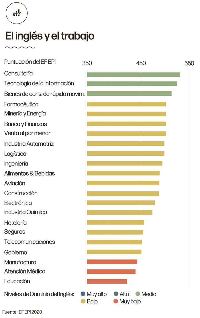 Tampoco la gran mayoría de sectores obtiene buenos resultados. De hecho, no hay un solo sector productivo que consiga un nivel alto de inglés. Solo la consultoría, la tecnología de la información y los bienes de consumo de rápido movimiento registran un nivel medio en dominio de este idioma.
