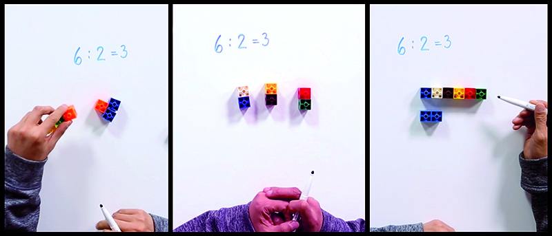 Otra forma de comprobar la diferencia entre las dos situaciones es verbalizar la operación y su relación con la multiplicación en términos de grupos.
