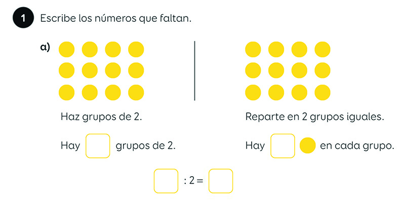 Vamos a ver un ejercicio, tomado directamente del libro de 2º de Primaria de Piensa infinito, de SM, para terminar de comprender estos dos significados de la división. Animamos al lector a que olvide por un momento los cálculos de divisiones, y a que intente hacer el ejercicio dibujando, como lo haría un alumno de 2º de Primaria que está empezando a trabajar la división. Solo al final resumimos la situación, escribiendo la representación simbólica de las divisiones que hemos obtenido dibujando (la representación simbólica es la misma en los dos casos).