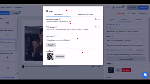Como docentes, en muchas ocasiones será importante poder compartir nuestras presentaciones una vez realizadas. En ese sentido, ya estáis viendo a lo largo de este artículo cómo podemos incrustar nuestras presentaciones de Mentimeter, sean de una o de más diapositivas, en una web o en un blog. Además, tenemos la opción de compartir sus enlaces o de bajárnoslas en PDF.