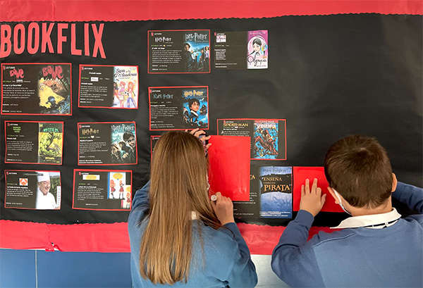 “Con la idea de una compañera que plasmó justo antes del confinamiento creé unas plantillas en genially con las que mi alumnado plasmaban datos de una lectura con la estética de esta conocida plataforma y nos lo sacamos al pasillo. El impacto de esta actividad ha sido muy positivo dentro y sobre todo fuera del aula, ya que múltiples alumnos de otras clases y cursos se paraban para comentar, señalar y sorprenderse de la estética Netflix en unos libros de lectura” explica Chumillas que además se ofrece a mandar una copia editable a través de las redes para llevar esta actividad en otras aulas.