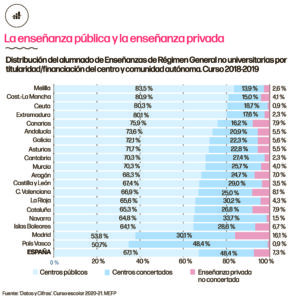 El porcentaje de Concertada no es el mismo en las 17 comunidades autónomas, ni la misma la tasa de alumnado inmigrante o con NEE que esta escolariza. Por ejemplo, en el País Vasco, 48,4% de Concertada, esta asume al 32,% del alumnado extranjero.