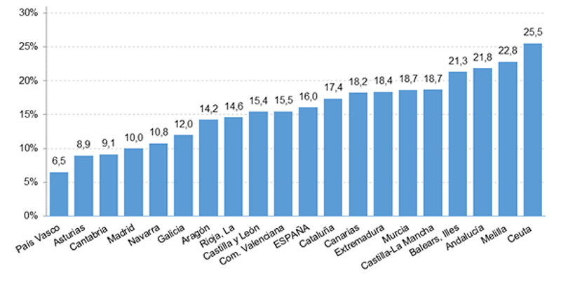 Por comunidades autónomas, hay cuatro que en 2020 han logrado situarse por debajo del objetivo del 10% y por debajo también de la tasa media de la UE (10,2%). Se trata de País Vasco (6,5%), Asturias (8,9%), Cantabria (9,1%) y Madrid (10%). Otras cuatro CCAA tuvieron tasas entre el 10% y el 15% (Navarra, Galicia, Aragón y La Rioja), mientras en el extremo opuesto, con tasas superiores al 20%, están Illes Balears (21,3%), Andalucía (21,8%), Ceuta (22,8%) y Melilla (25,5%). Castilla y León, la Comunitat Valenciana, Cataluña, Canarias, Extremadura, Murcia y Castilla-La Mancha obtienen tasas entre el 15% y el 20%.