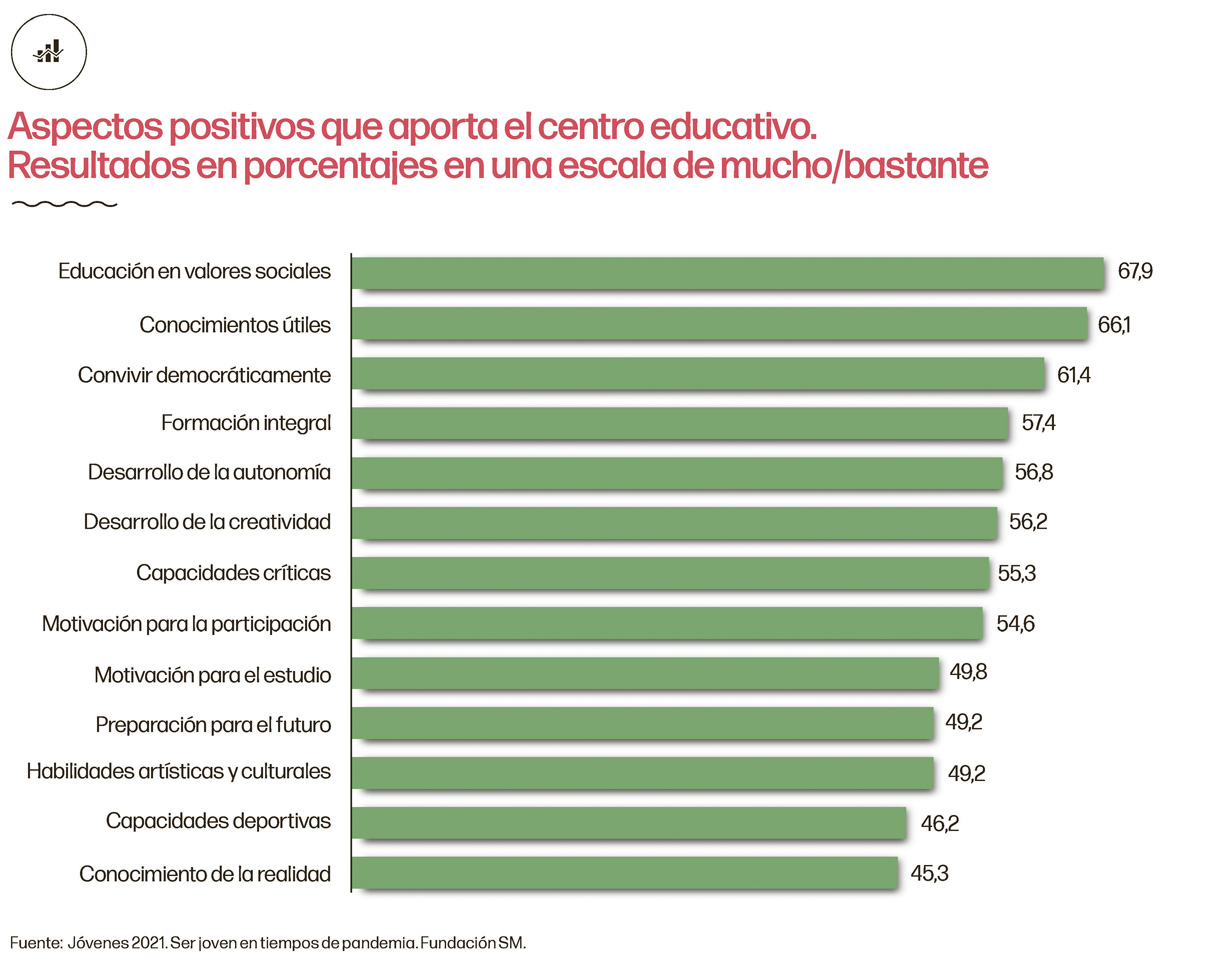 Independientemente de la gran variabilidad y las diferentes características de cada entorno académico, la impronta del centro educativo en el que se estudia o se ha estudiado es una realidad indiscutible, y así lo muestra el reconocimiento explícito que realizan los jóvenes de los diferentes aspectos que consideran que les han aportado en su Educación.