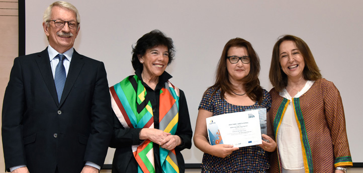 El secretario de Estado de Educación, Alejandro Tiana, la ministra Isabel Celaá y Consuelo Velaz (derecha) junto a uno de los premiados en el certamen eTwinning 2019 en junio de ese año. MEFP