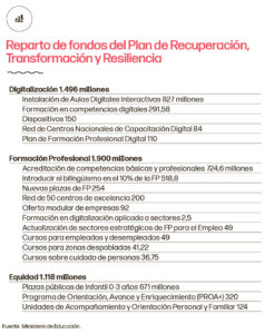 Las actuaciones del Plan del Ministerio, que se desarrollarán principalmente a través de programas de cooperación territorial, prevén destinar 1.900 millones a la «modernización» de la Formación Profesional, 1.496 millones a digitalización y 1.118 millones a prevenir el abandono temprano y mejorar los resultados educativos. “España tiene una oportunidad única con este Plan, y la reforma y modernización del sistema educativo será protagonista principal de la que, entre todos, tenemos que convertir en una historia de éxito”, señaló la ministra Isabel Celaá.