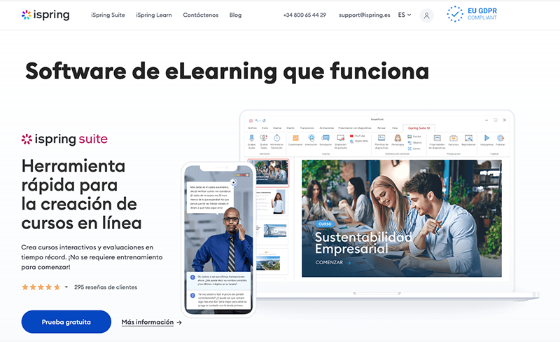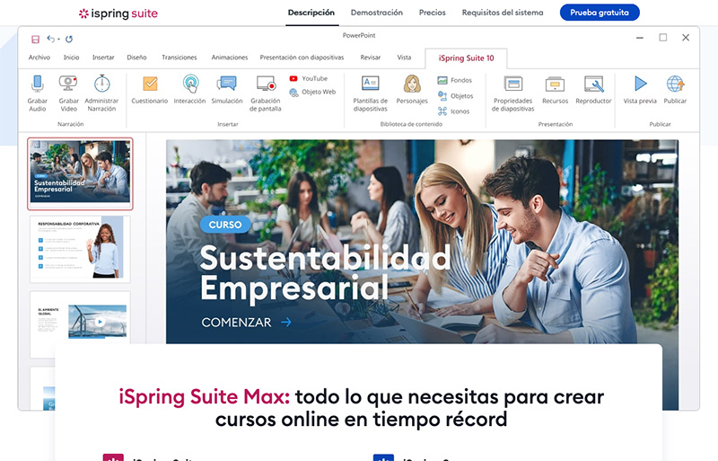 iSpring Suite Max es una herramienta de autor completa, extremadamente fácil de usar y suficientemente potente para crear un gran contenido de eLearning. Te ayuda a producir materiales de aprendizaje de aspecto profesional en tiempo récord: