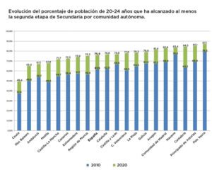 Por otro lado, tres de cada cuatro jóvenes de 20 a 24 años han alcanzado al menos el nivel de Bachillerato o FP Básica o de Grado Medio, de acuerdo con la ampliación de datos educativos de la Encuesta de Población Activa (EPA) publicada por el Ministerio de Isabel Celaá, con información del INE. Desde 2010 el porcentaje de estudiantes que han concluido al menos este nivel educativo ha subido 14,4 puntos hasta alcanzar el 75,9% en 2020. Respecto a 2019, el crecimiento es de 1,9 puntos.