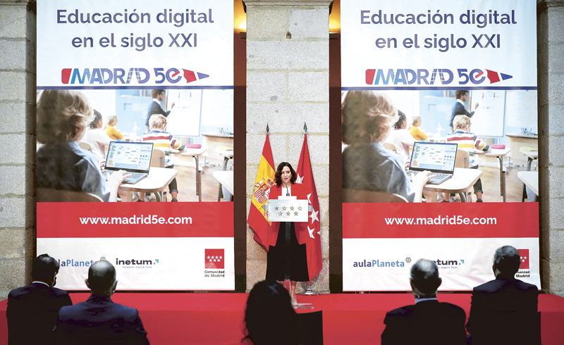 La presidenta de la Comunidad, Isabel Díaz-Ayuso, en la presentación de la herramienta de aulaPlaneta para alumnos y profesores. CAM