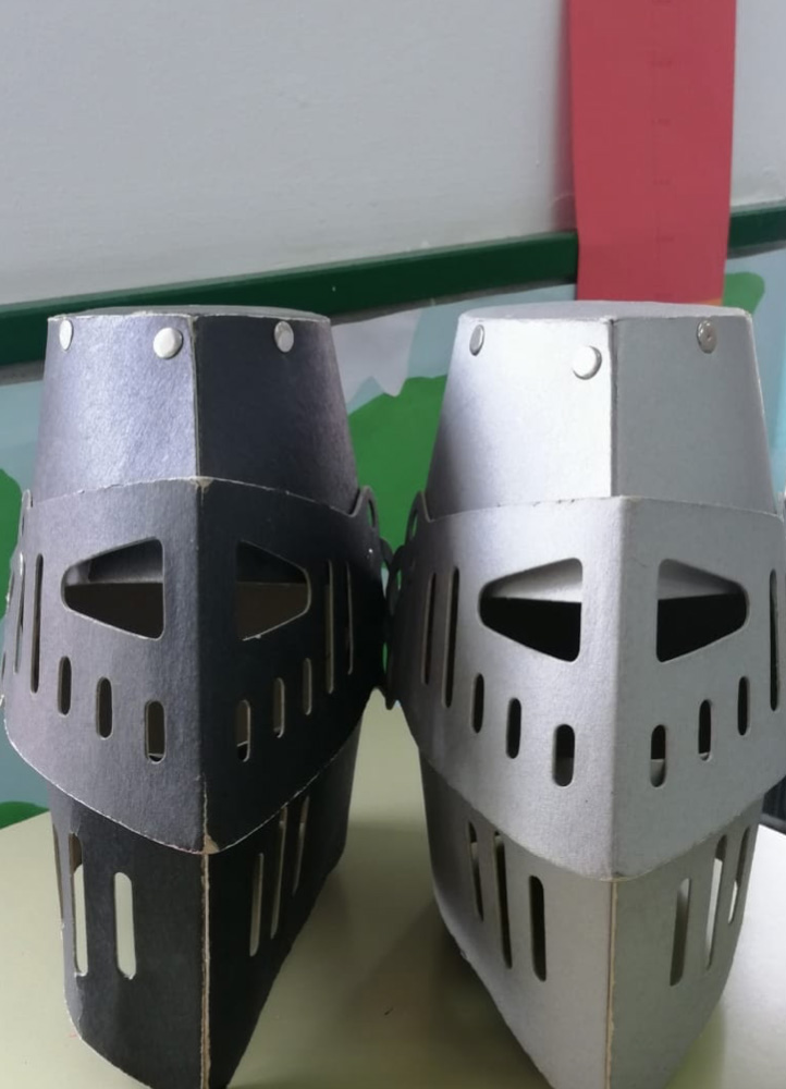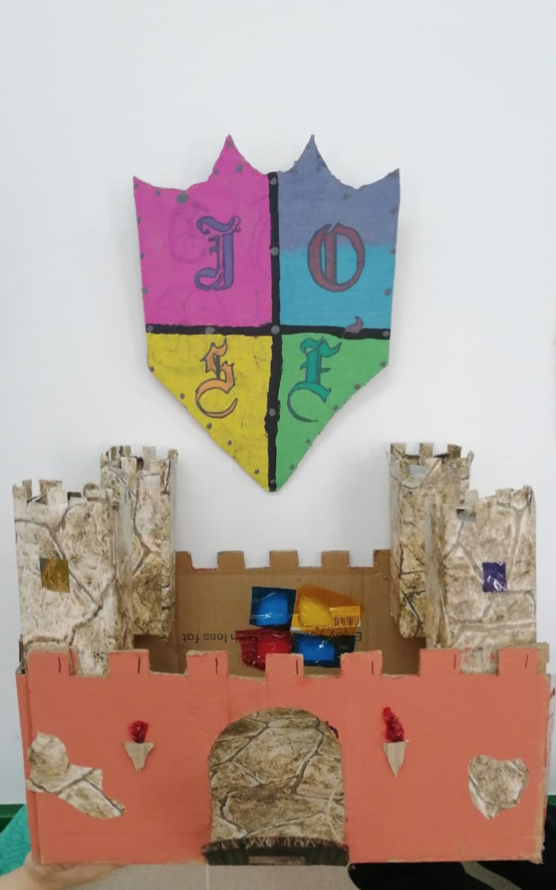 Paralelamente en el área de Arts and Crafts se realizaban las misiones más creativas y plásticas como el diseño de un escudo medieval, una espada, vidrieras para la decoración de las ventanas del aula, bolígrafos medievales… todo ello con materiales reciclados.