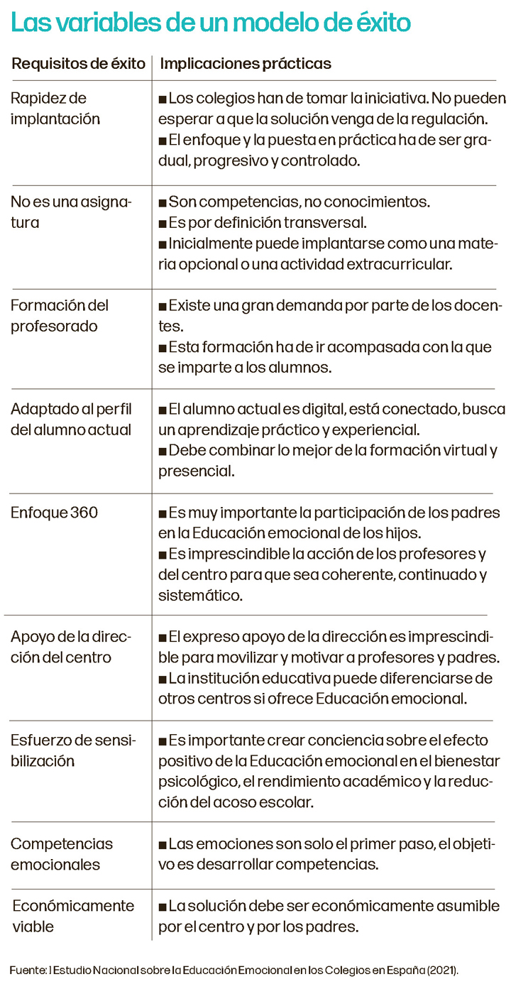 Aunque el sector educativo está altamente regulado, los colegios tienen suficiente flexibilidad para implantar la Educación emocional en sus programas sin tener que esperar un apoyo expreso de las autoridades educativas. Para llevarlo a cabo, Idiena recomienda que “la implementación sea progresiva, empezando por la formación del profesorado, involucrando a los padres e impartiéndola de forma transversal al alumnado, en un formato no solo presencial: la etapa post-Covid recomienda combinar una formación virtual y escalable, con un apoyo presencial que guíe y motive”.