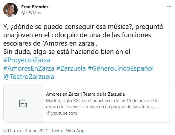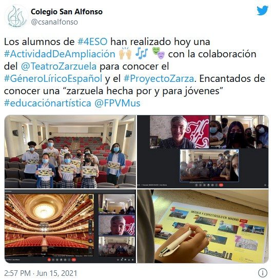 Para mí ha supuesto un giro hacia lo digital que me encanta. Por un lado, porque me apasiona el mundo de las TIC (de hecho, antes de acceder a mi puesto actual en el Teatro, fui Asesor Técnico Docente en el Área de formación en línea y competencia digital educativa del INTEF) y, por otro, porque me da la oportunidad de llegar a todos los rincones del país, uno de los objetivos que le plantee al Director cuando llegué al Teatro. Porque, como decía anteriormente, el Teatro de la Zarzuela es un teatro público, de todas y todos los españoles, y es muy importante hacer todo lo posible por llegar a todos los rincones (por ejemplo, este año, entre mayo y junio, he realizado sesiones online con grupos de estudiantes de centros de Andalucía, Asturias, Extremadura, Madrid y Valencia). En este sentido, no me gustaría dejar de comentar que las producciones del Proyecto Zarza ya empezaron a retransmitirse en streaming antes de la pandemia, lo que facilita que puedan verse libremente en el canal de YouTube del Teatro, llegando a centros escolares de dentro y fuera de nuestro país.