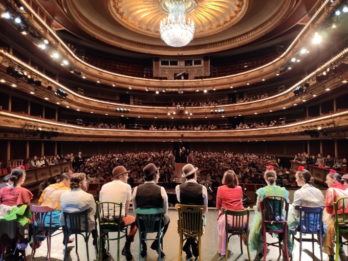 La sensación es un poco distinta en las funciones ‘en abierto’. Es cierto que, al principio, parte del público de zarzuela ‘de toda la vida’ no veía con buenos ojos las actualizaciones de sus obras favoritas pero cada año estamos constatando una doble realidad: cada vez hay más gente joven en las funciones de la tarde (estudiantes de universidad, de escuelas de teatro, música, etc., que ya conocen el Proyecto Zarza y lo anotan como cita ineludible en su calendario) y, por otro lado, el público más mayor se emociona viendo el Teatro lleno de una juventud que disfruta de la zarzuela, aunque sea en este nuevo formato, tanto como ellos. Porque otra de las claves del proyecto es que la música, aunque arreglada para un grupo de cámara, es la de la obra original, las y los jóvenes van a escuchar la música que Bretón compuso para ‘La verbena de la Paloma’, que Chapí compuso para ‘La revoltosa’ o que Chueca compuso para ‘Agua, azucarillos y aguardiente’ (porque sí, Chueca, el de la plaza y la estación de metro, fue un compositor, y es importante que se sepa que en España también tenemos nuestro patrimonio, nuestros compositores, nuestra música).