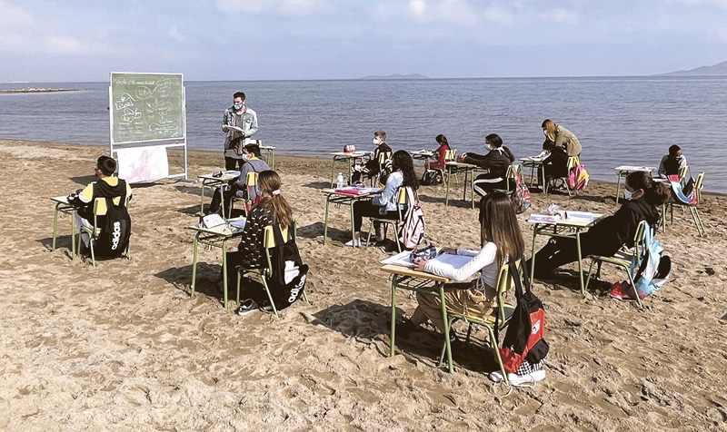 Además de reducir el riesgo de contagio, mayor en espacios cerrados, el colegio se ha abierto al entorno. Con la playa como escenario, los alumnos han podido escuchar cómo el pescador más viejo del lugar les explicaba las tareas, las formas, las redes de pesca. También han aprendido cómo se creó su pueblo de boca de sus vecinos, vestidos de cartagineses y romanos en la festividad comarcal. O han escuchado al doctor Juan Antonio Ortega, director de la Unidad de Salud Medioambiental Pediátrica del Hospital Universitario Virgen de la Arrixaca, explicarles por qué este año se ha reducido la incidencia de diversas enfermedades por el mantenimiento de las mascarillas. También han pintado lienzos a orillas del Mar Menor. Y se han concienciado medioambientalmente, ante la segunda laguna más grande de Europa, sobre el papel que cada agente ha jugado en su progresivo deterioro y el que que pueden jugar las jóvenes generaciones que hoy se sientan en pupitres con vistas al Menor para recuperar este espacio natural protegido.