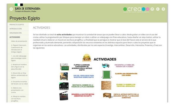 Proyecto Egipto y Golden Age project sirven como ejemplo de actividades a realizar en el Aula del Futuro y permiten mostrar la utilidad de los distintos espacios del Aula del Futuro y ayudan a comprender cómo se pueden integrar los recursos tecnológicos disponibles en el desarrollo de proyectos educativos. En ellos podemos encontrar hasta ocho actividades distintas que muestran la variedad de tareas que se pueden llevar a cabo: desde grabar un vídeo con el uso del croma, utilizar la programación por bloques para manejar un robot o utilizar un videojuego con fines educativos, hasta diseñar un stop motion, utilizar la realidad virtual o elaborar un mural con escritura jeroglífica o medieval. Las actividades están clasificadas por espacios, lo que permite ver la utilidad de cada una de las zonas del Aula del Futuro.
