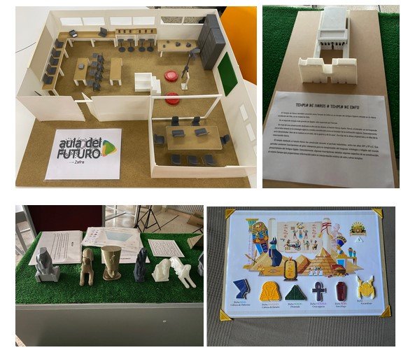 Destacar que, junto con el desarrollo del proyecto, se elaboraron también una serie de materiales en formato físico que complementarían a estos recursos virtuales. Por un lado, se diseñó una maqueta en Impresión 3D para mostrar los distintos espacios del Aula del Futuro del CPR de Zafra. Por otro lado, se diseñaron una serie de materiales con la impresora 3D que sirvieran como recursos para el Proyecto Egipto: pirámides, esfinges, bustos de faraones… y una maqueta del templo de Horus. Finalmente, se diseñó un tablero que sirviera para registrar las tareas que cada uno de los grupos iría superando.