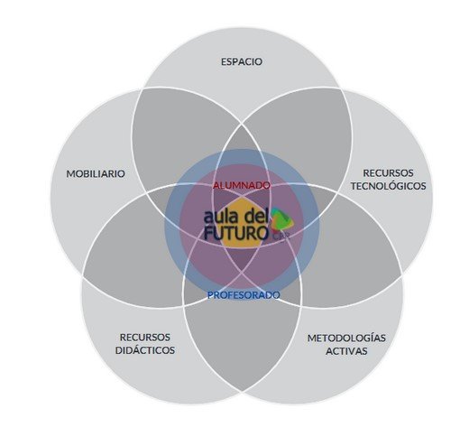 Como consecuencia, se crea el Aula del Futuro, un espacio flexible y dividido en seis zonas de aprendizaje cada una de las cuales ha sido concebida, por su distribución espacial, su mobiliario y su dotación tecnológica, para realizar un determinado tipo de actividades que potencien un determinado estilo de enseñanza y aprendizaje. Este modelo obliga, a alumnos y profesores, a un cambio de roles, lo cual implica un cambio metodológico.
